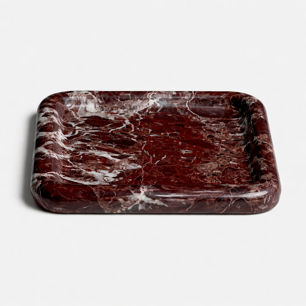 Amalia TrayThe Amalia tray is carved from richly veined Rosso marble, this sculptural tray balances bold color with refined form. Its deep red surface is threaded with natural white and charcoal markings, making each piece uniquely expressive. Polished to a soft sheen and finished with gently rounded edges, it works equally well as a functional catchall or a statement object—bringing a sense of quiet luxury to any surface.