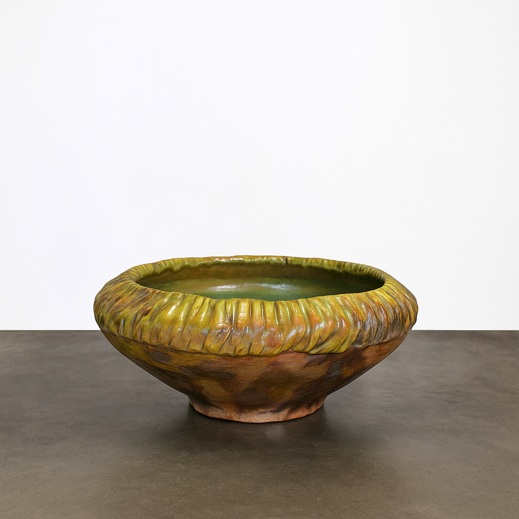 Bowl VerdeThis vintage 1980's signed ceramic bowl, known as Bowl Verde, features an irregular, tactile texture that adds depth and character. Finished with a rich brown and green glaze, its earthy tones blend harmoniously to create a natural, organic look. A beautiful handcrafted piece, perfect as a functional bowl or a unique decorative accent in any vintage or rustic setting.