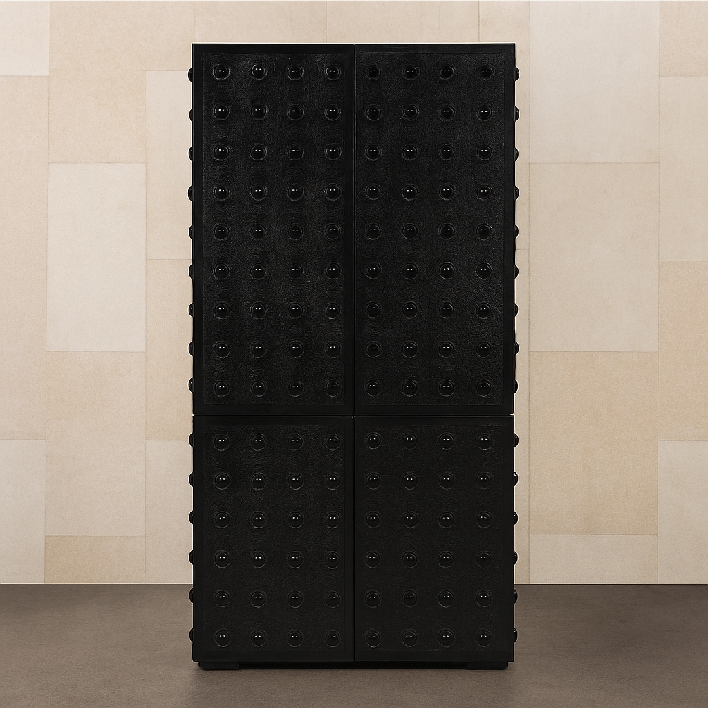 The Hira Hutch in walnut with a black stain combines sleek modern design with practical storage, showcasing rich wood grain in a bold, contemporary finish.