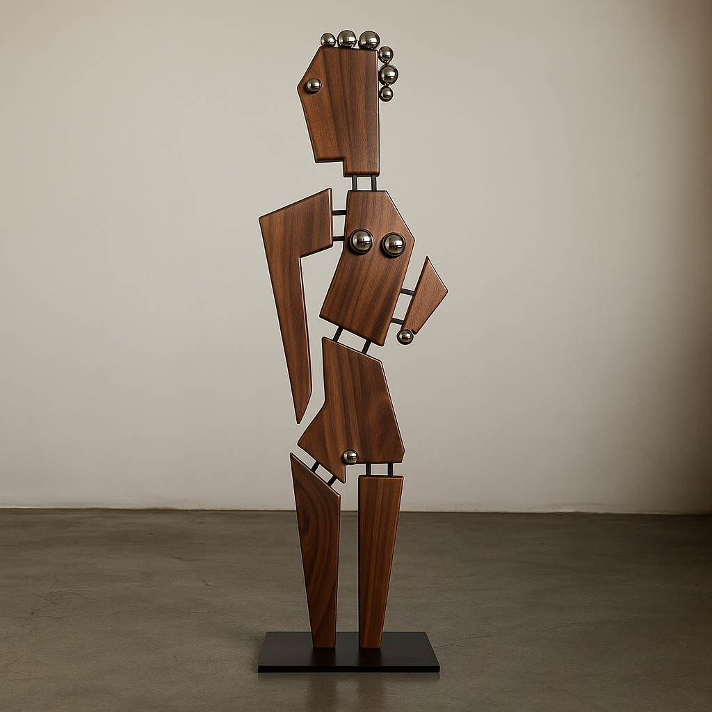 Nancy SculptureA singular work of art, this abstract sculpture was first conceived in 2018 and later reimagined through the distinctive vision of Bilal Rehman Studio. Crafted from geometric walnut forms, the figure’s angular silhouette is punctuated by polished chrome spheres that highlight its joints and features, creating a dialogue between organic warmth and industrial refinement. Resting on a black steel base, the piece embodies the tension between tradition and modernity, stillness and motion.