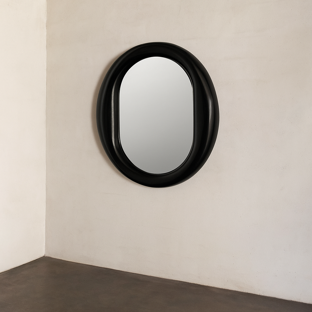 The Yara Mirror pairs sculptural round design with Mindi wood in a black stain, blending bold form with timeless reflection.