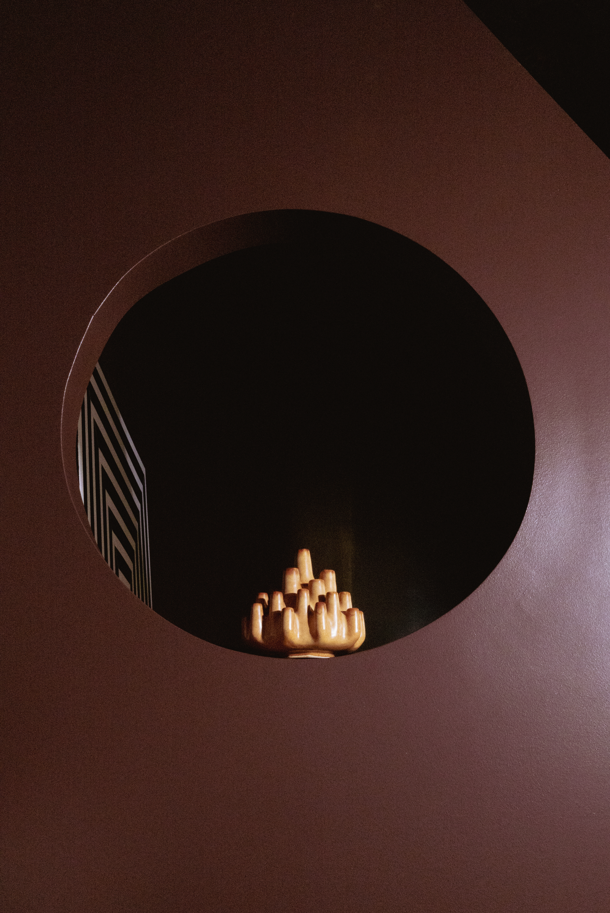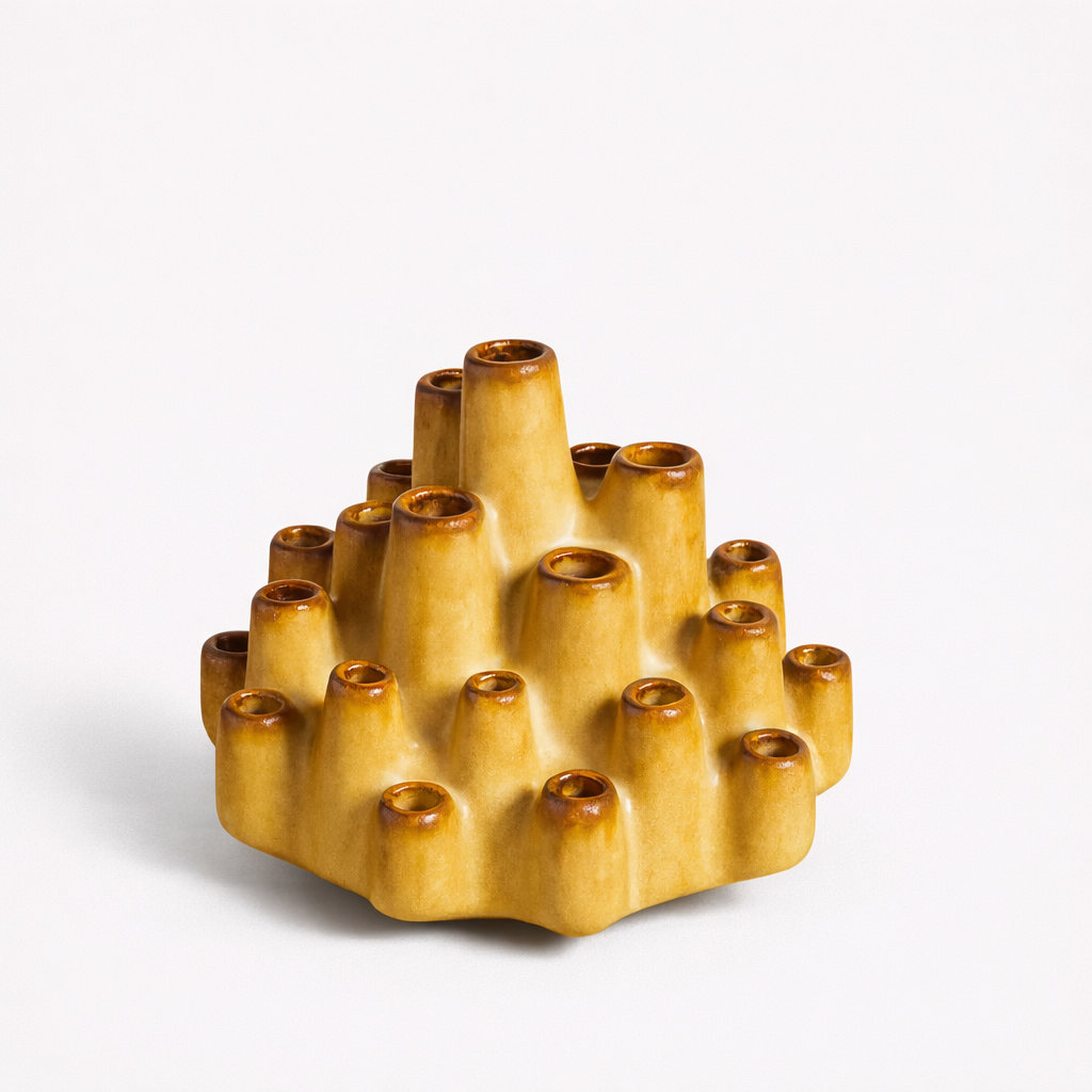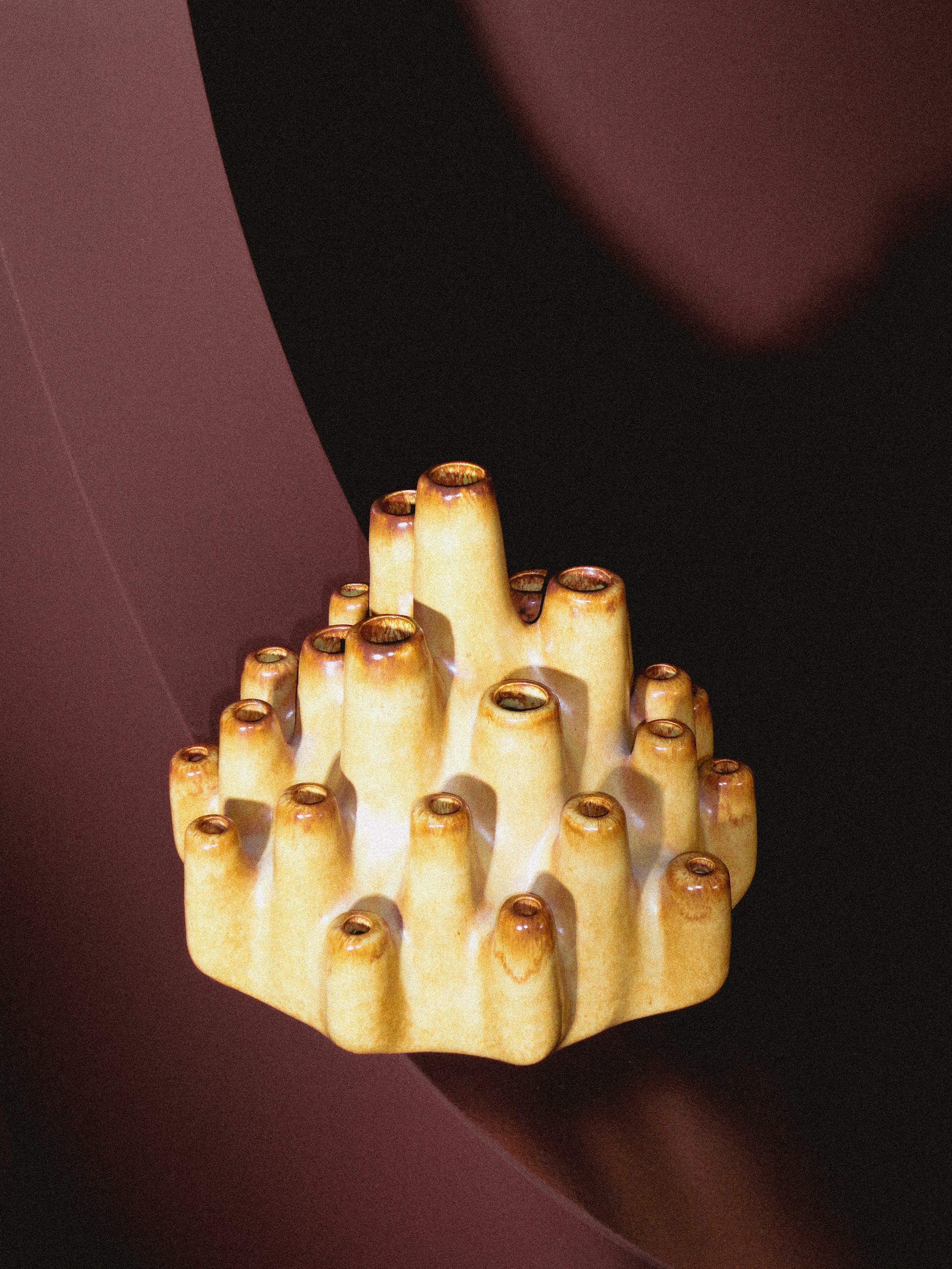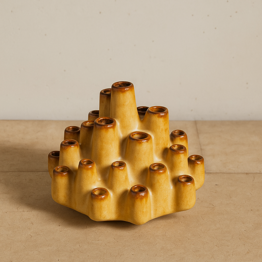 Tabacco ScreziatoA striking fusion of modernist form and brutalist edge, this 1970's Tabacco Screziato vase by Giovanni Bertoncello is more sculpture than vessel. With its architectural chimney shape and mottled tobacco glaze, it channels both industrial design and natural erosion. Bold yet contemplative, the piece reflects Bertoncello’s talent for turning clay into abstract poetry—an icon of midcentury Italian ceramics that feels timeless and evocative.