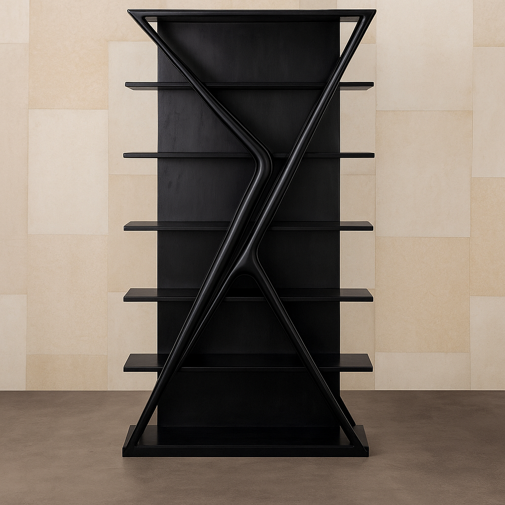 Affilato BookcaseStrikingly carved of teak finished in hand rubbed black, this unique bookshelf features and exuberant bent X embellishment that creates a cage-like effect and results in a truly next level design.