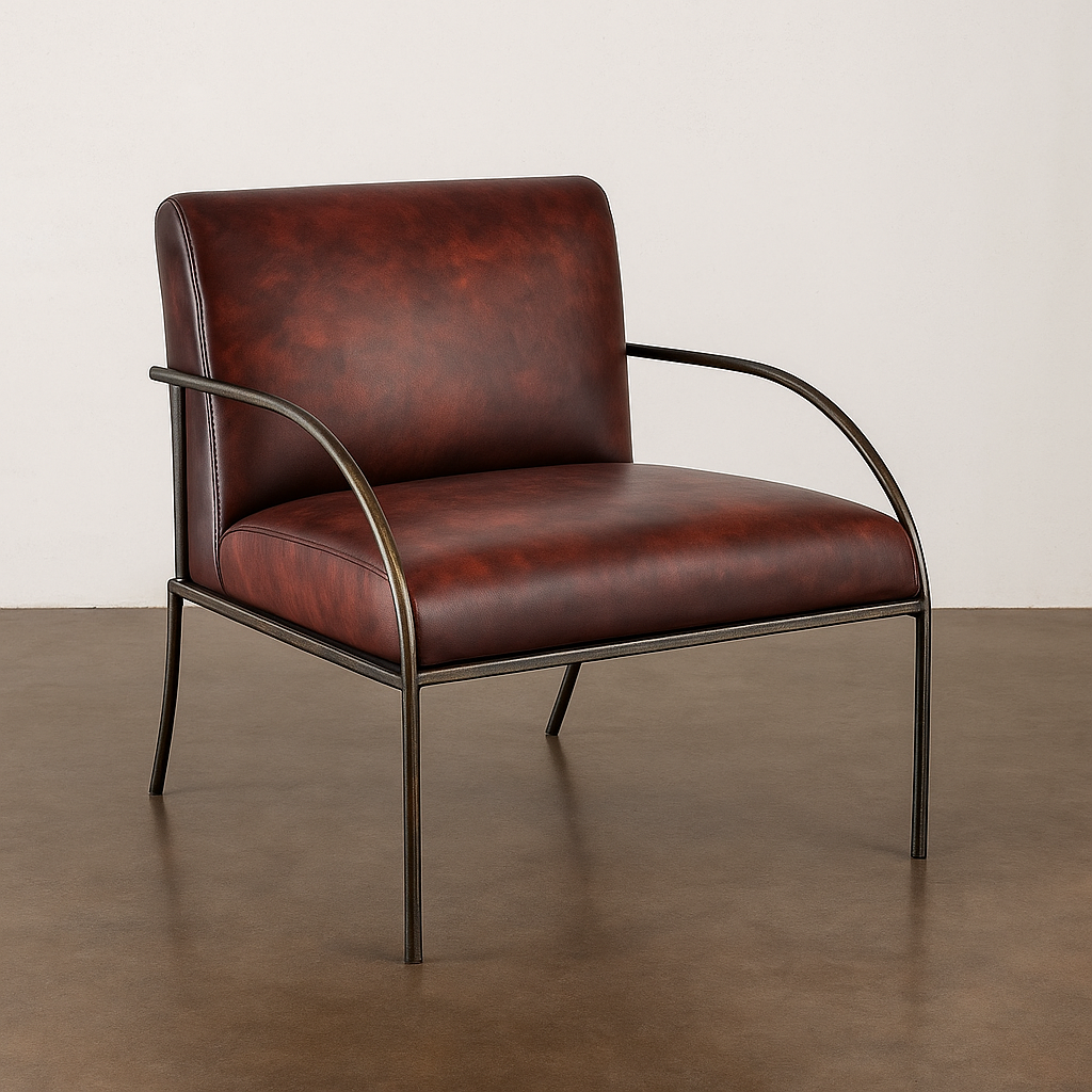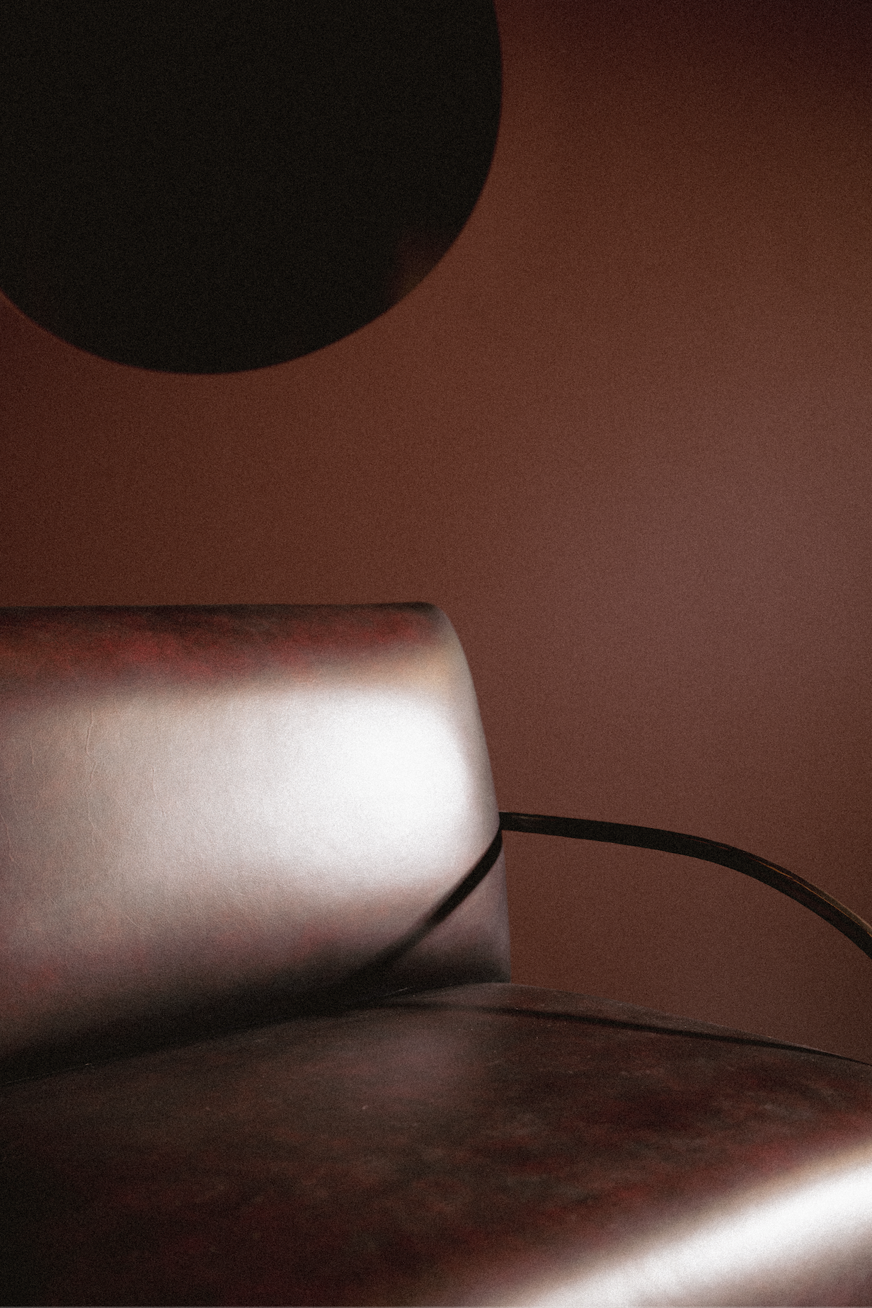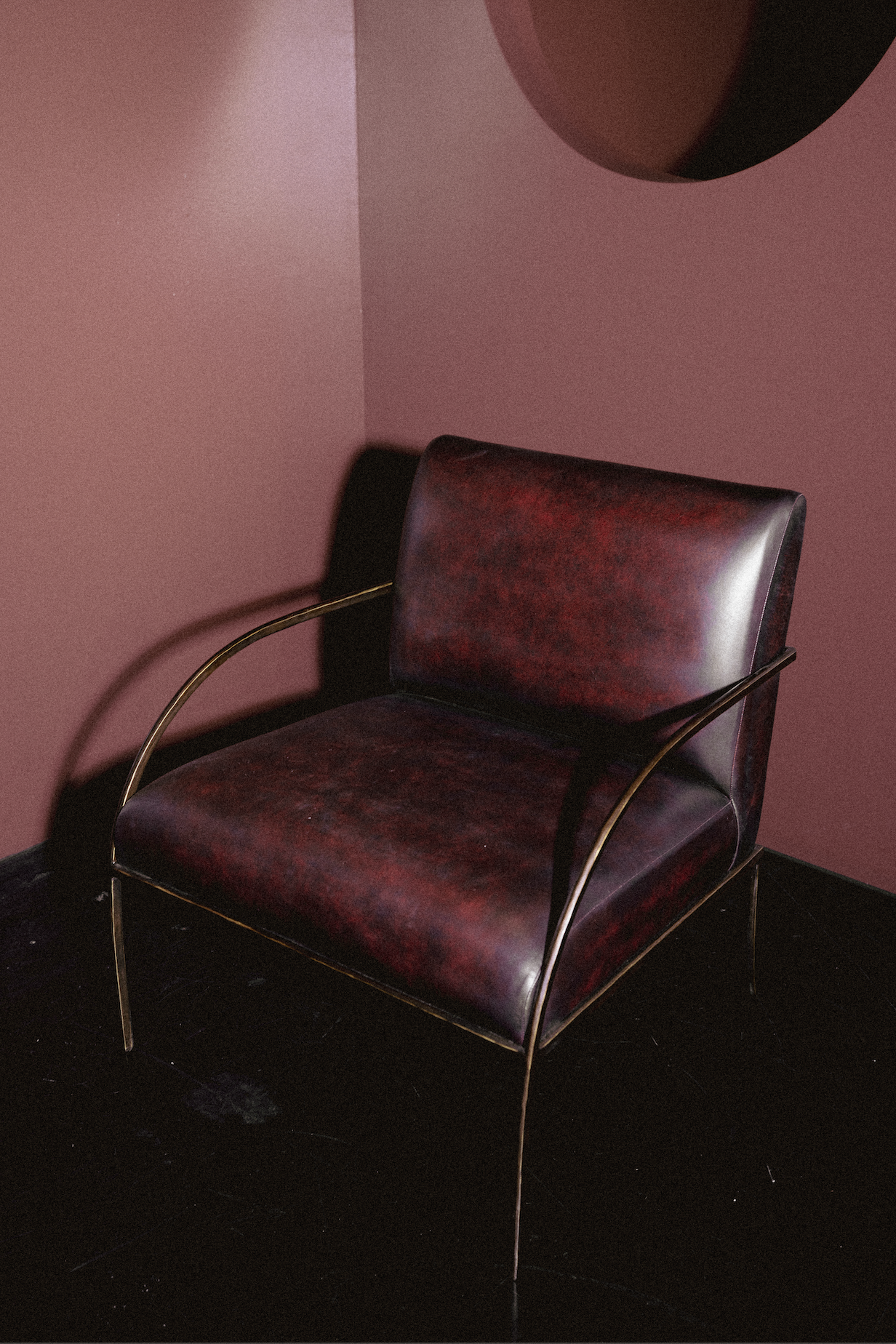 Salvatore ChairThe Salvatore Chair marries elegance with craftsmanship in a seamless, sculptural form. Its fluid silhouette is framed in bronze-finished iron, while the hand-distressed, dappled red leather adds a layer of artisanal character—rich with texture and depth. This is more than seating; it’s a statement in refined, contemporary design.