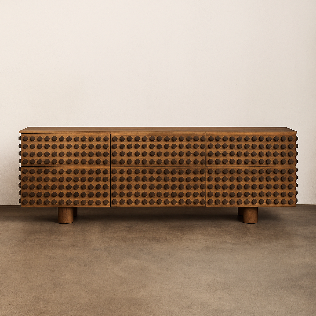 The Matteo Credenza in walnut and veneer is an extra-long storage solution that combines sleek modern lines with timeless craftsmanship. Its warm wood grain and minimalist silhouette make it a statement piece, while the extended length provides ample room for dining essentials, media equipment, or office storage.